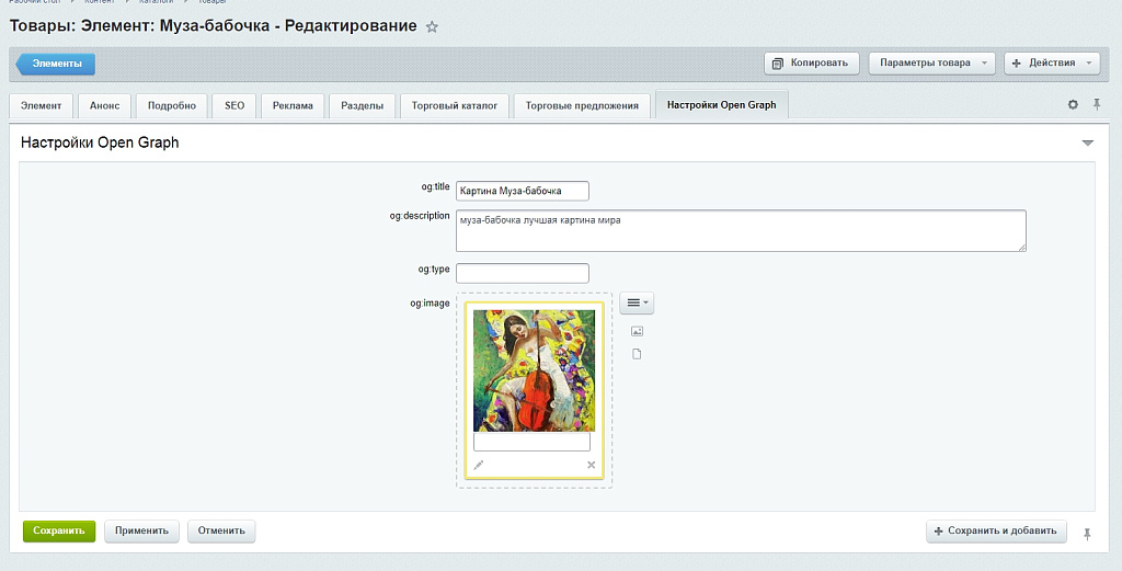 - Выводит у элементов и разделов Open Graph поля, для заполнения.