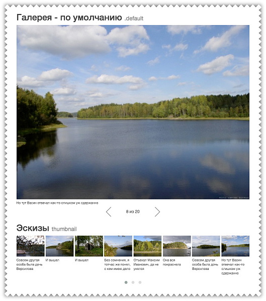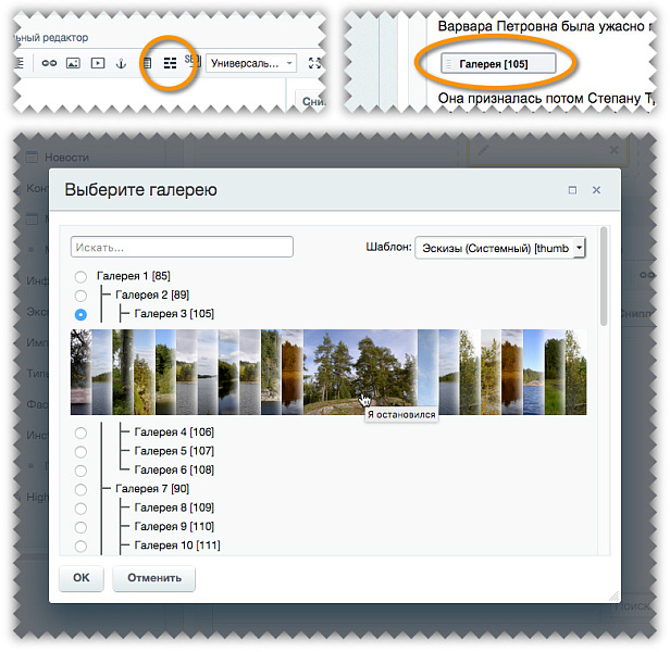 Вы можете размещать галереи как непосредственно на страницах и в тексте элементов, разделов информационных блоков, так и в любом другом тексте который задается как в административной, так и в публичной части.