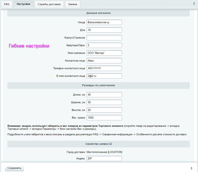 • Вывод возможных вариантов доставки в зависимости от размеров и веса товара;