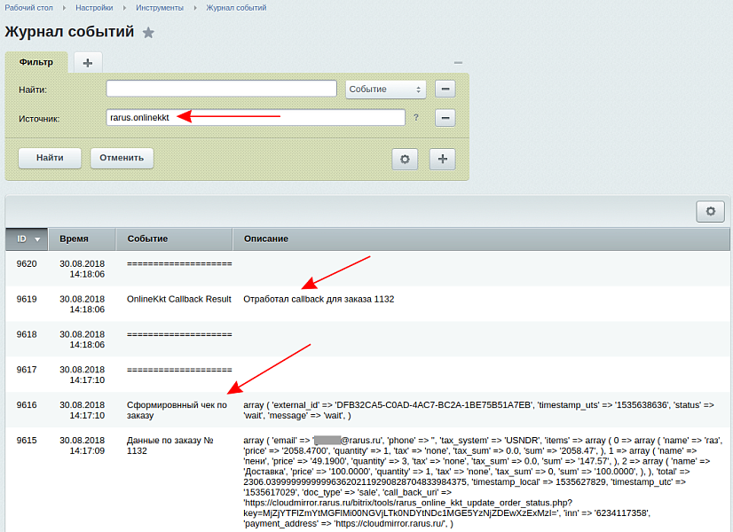 В «Журнал событий» добавлен вывод ответа callback по чеку.