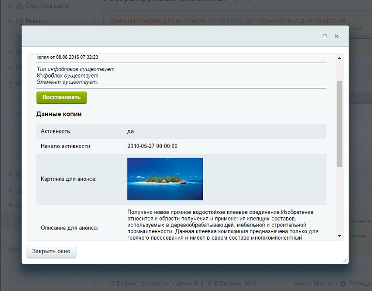 Если же тип и инфоблок существуют, то информация о них не меняется, сами свойства не обновляется. Модуль в этом случае восстанавливает элемент с привязками к разделам и значения свойств. Если тип свойства с момента сохранения копии изменился, это может вызвать определенные проблемы. Если свойство было удалено, оно не будет восстановлено. Картинка анонса, детальная картинка и файлы свойств восстанавливаются в файловой таблице и физически в папке upload со своими подпапками.