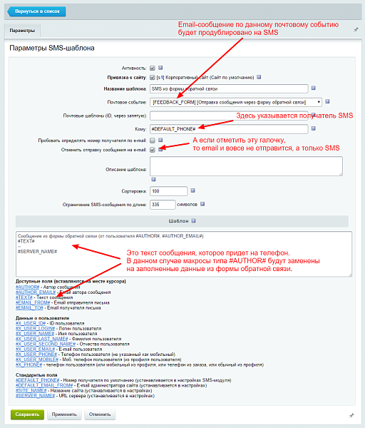 6. SMS-дублирование (с настраиваемым текстом) любых e-mail сообщений, т.е. автоматическая отправка SMS при любых почтовых событиях (новый заказ на сайте, изменение статуса заказа, регистрация пользователя, сообщение из формы обратной связи и все остальные существующие в системе типы почтовых событий),