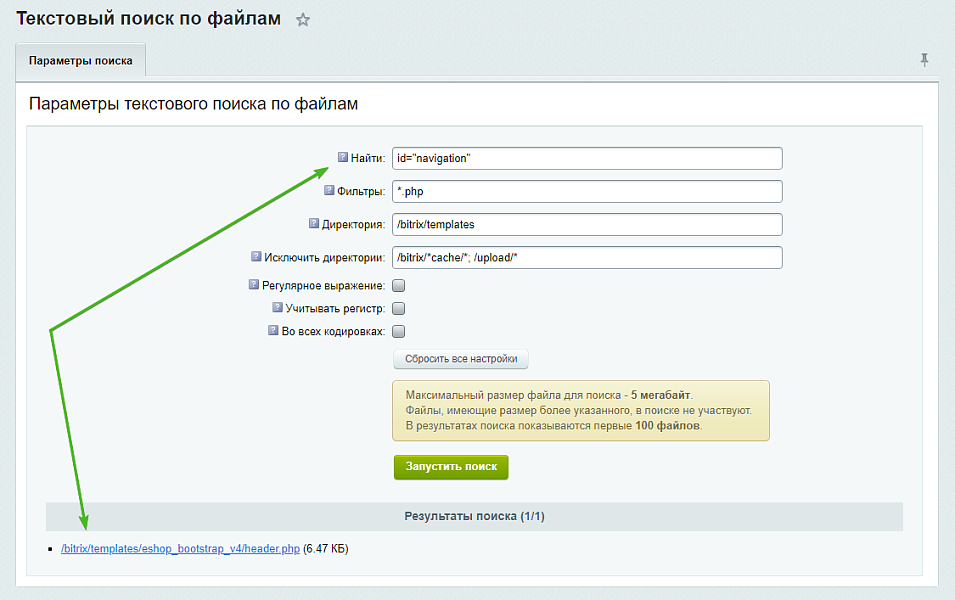 - Добавлен новый функционал: «Текстовый поиск по файлам». Этот инструмент позволяет найти текст в любых файлах сайта. Поддерживаются регулярные выражения, учет регистра, возможность поиска в обеих кодировках (UTF-8 и windows-1251) одновременно, указание директории для поиска (с учетом маски), а также указание директорий для исключения (с учетом маски).