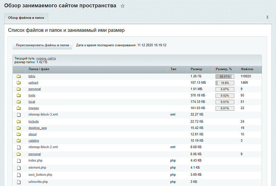 Исправлена ошибка, возникающая на некоторых сайтах в момент начала сканирования файлов и папок при подсчете занимаемого пространства. |