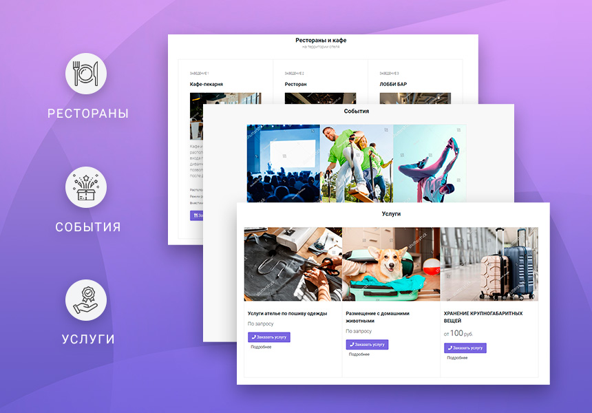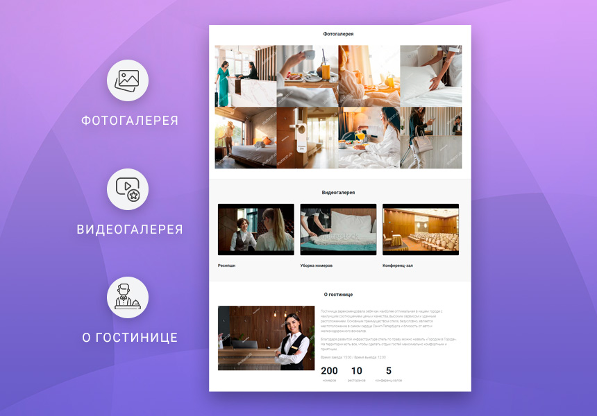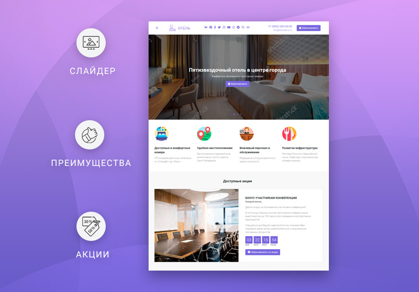 Готовое решение для быстрого запуска сайта отеля, гостиницы, гостевого дома, базы отдыха, хостела или санатория. Благодаря готовому решению Вы легко и быстро сможете запустить свой сайт в интернете, для этого вам нужно только наполнить сайт Вашей информацией.