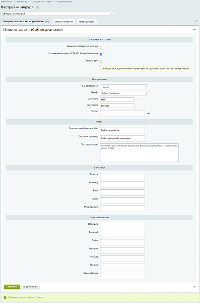 Данное решение позволяет установить заглушку для сайта, которая будет отображаться в случае закрытия доступа к публичной части.