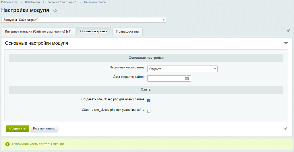 • Вы можете указать дату открытия публичной части сайтов, по истечению которой сработает агент, который включит публичную часть. На самой заглушке будет отображен обратный отсчет до включения сайтов.